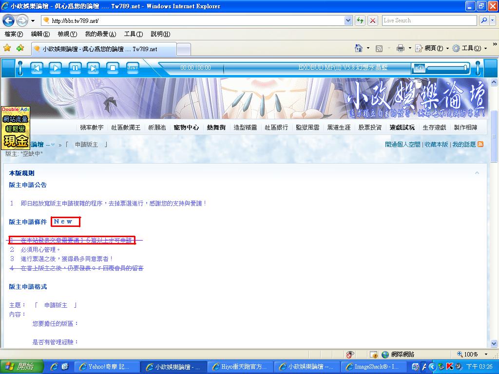 ※≡ 論 壇 人 才 大 招 募 想 要? ≡※ ˇ.想當板主嗎?論壇各版都可以報名喔! 《點我報名》 ˇ.沒有你想要的版?由你來創版吧! 《點我創版》 ˇ.喜歡自拍?那就和我們分享你的照片吧 《點我分享》 ˇ.對論壇有什麼意見想反應嗎? 《點我反應》 ※≡ 有 什 麼 問 題 不 敢 說 嗎 ? ≡※ 網站總站長:《傳訊息給我》 論壇副站長:《傳訊息給我》 論壇總版主:《傳訊息給我》 或者請您告知論壇客服人員...他們會很高興為您服務。 ※≡ 廣 告 刊 登 ≡※ 廣告刊登信箱:[email protected] 來信請註明廣告刊登,並附上您的聯絡方式! 電話、信箱、即時通、msn!將由專人為您服務。 |